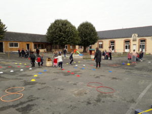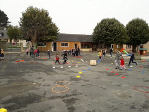 Après la récréation du matin, les maîtresses nous ont organisé un grand jeu. C’était les « déménageurs de kaplas ». Par équipe de 8/9 enfants de toutes les classes nous devions suivre un petit parcours pour aller chercher un kapla puis revenir en refaisant le parcours. Ensuite on donnait le kapla au premier qui le faisait passer au second, puis au troisième … qui le déposait dans une boite.